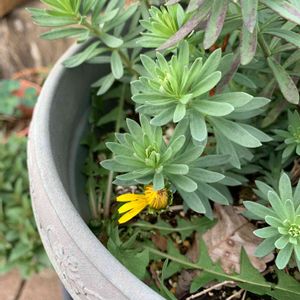 鉢植えのユーフォルビア、不思議な姿になっています🪴 50センチくらいの茎が5本立ち上がって、寒さで❄️先端が曲がったところに、黒い花が咲いてきて、見方によっては気持ち悪いかも😅