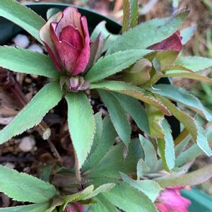 こちらは実生のクリスマスローズです😀 鉢に張りついたつぼみがかわいいのでパチリ✨ 鉢にさしてある記録によると、小さめで濃いピンクからグリーンのグラデーションで咲くようです。 ただ、実生の場合、その年毎で咲き方が違ったりするので、これからのお楽しみです😀