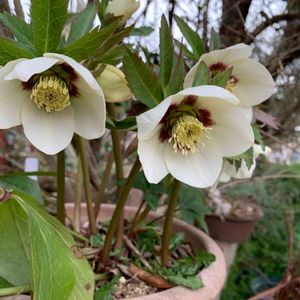 実生のクリスマスローズです☺️ シンプルな白の一重に黒茶色のネクタリンに金色の花芯。 お気に入りです✨ 10年クラスの古株で、鉢の中いっぱいに20本くらいの花をつけていましたが、根元のコブみたいなのがどんどんひどくなり、3年前に植え替えを決意🌟植え替えた後は元の通りになかなか咲きませんでしたが、今年はやっと10本以上の花をつけるようになりました🙆♀️