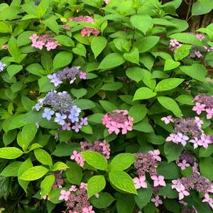 山アジサイ 七変化、青、ピンク、紫の花が分かれて咲いていて面白いです☺️ 前は青、ピンク、紫の花が散りばめられたように咲いていた年もあるので、その年その年、違った顔が見れて楽しい💕