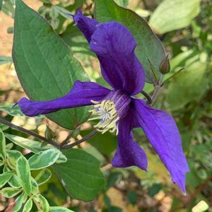 クレマチス ニューヘンダーソニーです☺️ 昨年、クレマチス 講習会に参加した時もらったもので、小さな9センチポットでしたが、こんなに素敵な色の花が咲きました✨ ラベルにベンダーソニーとあったので、本で調べてもっと薄いブルーの花が咲くと思ってましたが、咲いてきたらこんなに濃いブルーで‥。よくよくラベルを見たらニューがついてました😅ヘンダーソニーは50センチほどで鉢植えで育てられるみたいだったけど、ニューはツルを伸ばすようで今年はつかまる場所がなくてとなりの植木に絡みついてます🌿