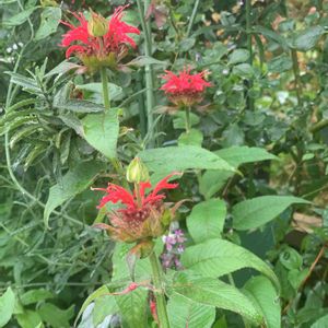 こちらはボーダー花壇に毎年咲いてくる赤いモナルダです☺️松明草(たいまつそう)という別名の通り、たいまつのように真っ赤です。真っ赤に咲いた姿に気を取られていましたが、よく見ると花が2段式になっているし、ムラサキのモナルダと似ています🌿