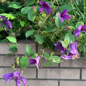 クレマチス ブルーピロウッテです☺️花びらが少しよじれる咲き方が独特で気にいってます。インテフォグリア系で、1メートルほど伸びた先に花がつくので、最初の年はさみしい感じでしたが、今年は一気に大株になり、幅1メートルほどのところに広がっています🌿 写真はボーダー花壇に垂れ下がって咲いている部分です。左のほうには、真っ赤なチェリーセージ🍒の枝を支えにして咲いていて、右の方にはバラ オルブライトンランブラーのオベリスクに誘引して咲いています。インテフォグリア系は自立できないのに自分でツルを出してつかまることもない‥ということで扱いが難しいな〜と思っていましたが、使い方によってはいいかも✨とやっと気づきました😀