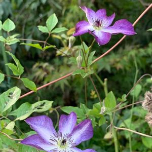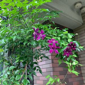 クレマチス おそらくアラベラです。 10年くらい前にまとめてもらったので、あまり記憶が定かでありません😅どれくらい伸びるかわからなくて、1メートルほどのオベリスクに巻き付けましたが足りず、2メートルほどの緑の支柱を3本組んでそこにはわせています。だからかなり上の方で咲いています。 今年はいつもより小ぶりな5〜6センチくらいのかわいいサイズの花が咲いています。色もピンクに近い薄ムラサキです。クレマチスって、花の大きさが違うとまるで別の種類の花のようで楽しいです💕