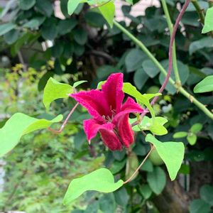 クレマチス レディバードジョンソンです☺️テキセンシス系のラッパ型のクレマチス が好き💕で、いくつか植えていますがなかなか思うように咲いてくれません💧 こちらは、赤いバラの🌹ダイナマイトと一緒に咲くことを期待してアーチにはわせていますが、つぼみの期間が長くてやっと開いたら、ダイナマイトはほとんど終わっています😅切れ込みのしっかり入った色もステキなクレマチスですが、つるも赤くて葉の形も独特で気に入っています。ミソはツルを2メートルくらい伸ばさないと咲き出さないことです。クレマチス って深いですね☺️