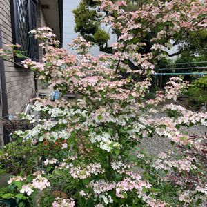 ヤブアジサイ⁉️じゃなかったかな。 確かな名前がわからないです😅 あっ🤭思い出した❗️ ヤブデマリです。 今年はピンクから白のグラデーション🎨で咲いています。もともとはピンク🌸 とにかく花数多くキレイです。 実は下が7号くらいの鉢の🪴まま、下に根を張っているので、いつ根詰まりするかと心配なところです😊