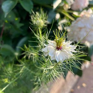 私の好きなニゲラの花です😊 なんとも独特な花姿とつぼみの形、細かい葉も存在感あります✨✨ こぼれ種で10年以上つないでいます🌱 最初は確かに青いニゲラの種を蒔きました。 ボーダー花壇全面に広がりキレイでした✨ 次の年、白い🤍ニゲラの花が咲き、だんだん青は減り全て白い花となりました。 昨年はオルレアの勢いに押され、たった3株しか咲けなかったニゲラ。 無くしてはならん❗️と強制こぼれ種をここにもあそこにも🌱🌱🌱 そのおかげか、今年はたくさん増えてくれました😊