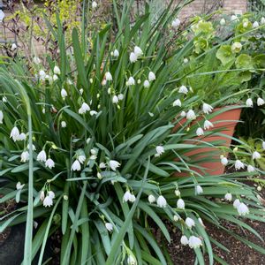 白いベル型の花がかわいい💕 スノーフレーク(スズラン水仙)です😊 脇にある大きな株から、こぼれ種で出た🌱ので、まだ花数は少ないけどその分ひとつひとつの花はよく見えます👀 みんなお日様のほうを向いて咲くのですね😊