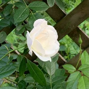 アイスバーグ咲き始めました🌿🤍 さくらんぼの木の下なのでどうしても日当たり悪いけど… 別名:白雪姫 だけあって純白だね✨🤍🍀 トゲが無いからとっても扱いやすいバラです🌹