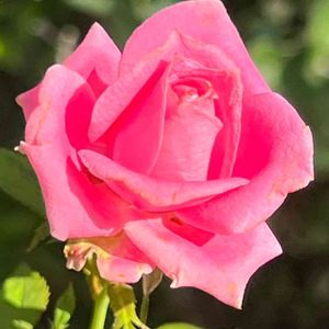 四季咲き中大輪バラ エドゥアール・マネ夏バラ開花❤🩹 株の下からシュートが長く伸びて、その先に咲きました 枝の先に三花咲きそうです‼が すぐビンチします✄ 枝を斜めに倒して、たくさんの脇芽の秋バラを促します