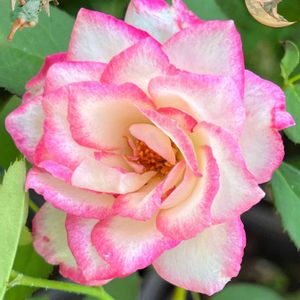 四季咲き大輪バラ プリンセス ドゥ モナコ満開です ビンクの縁取りが可愛いバラです、夏バラは開花が速く つるバラの伸びたシュートで見え隠れしていたのね‼️