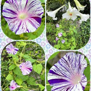 7月になってフォロワーさんから種をいただき蒔いた朝顔 今朝は小雨の中、紫のストライプ柄で初めての開花です 高砂百合の下、行灯仕立てにしました❣ありがとう💟
