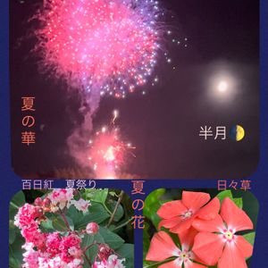 昨夜の夏祭りの花火 スターマインを始め様々な花火🎆 久しぶりに夜店も出店した祭りで、近隣からも集まり 私達家族は足柄駅から、半月🌛と一緒に眺めました🎇