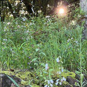 森の向こうから朝日が射して、土手にはイワシャジン いつの間にか、今年はたくさん群生してきました🤍 ツリガネニンジンの様な山野草ですが、大好きな花です