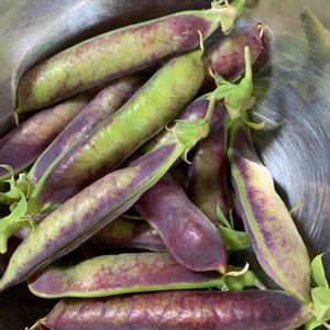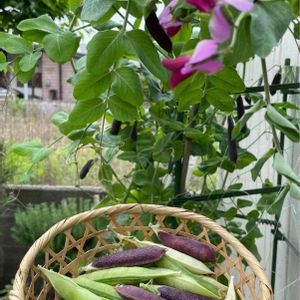 ツタンカーメン(紫エンドウ)の鞘が紫にならない豆もいましたが、見切って獲りました。まだまだ収穫は続きそうです😄。