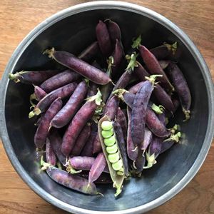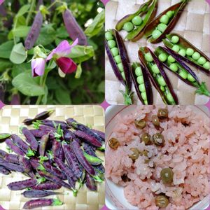 ツタンカーメンのエンドウ豆(紫エンドウ)を近所の方からいただきました。 花の色は紫色です。 早速豆ご飯にしました。