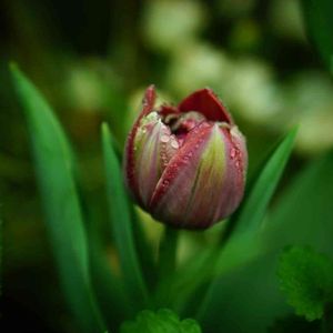 春の雨 緑も花も鮮やかに感じる😊 春の球根リレーもチューリップが加わると華やかだねー♪ こちらはグドシュニクダブルという品種。手のひらくらいあるんじゃないかと思うような大きな花。 色幅が大きいとの事でしたが我が家は鮮やかな赤! 葉を広げ出したカシワバアジサイの前に植え込んでたら芍薬のような雰囲気が味わえました😊 頭が重すぎて雨が降るとコロンコロン寝転んじゃうんで支柱が必要な事が分かりました。 来年も植えたくなる花じゃ♪
