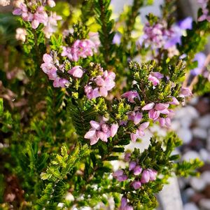 庭の地植えのカルーナ ガーデンガールズ 😳 オデカケ デスカ シベリアなどが原産で 🍂🧹👘 レレレ ノ レ~ 高温多湿が苦手らしいですが 花が咲いています😳 カルーナは掃くという意味とのことで 枝でホウキ🧹を作ったことに由来するそうです