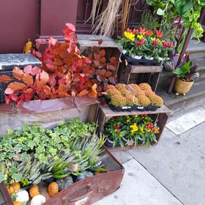 例の職場近くの素敵なお花屋さん。 秋っぽいディスプレイがめちゃくちゃカワイイ💜 いつでも、来れるから、見るだけよ! いつでも買えるから、見るだけよ! うみきりんさんに教えて頂いた呪文をちゃんと唱えて衝動買いは控えております😅
