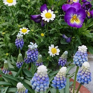 12月に3品種植えたうちの タッチオブスノーが 咲き始めました(*^^*) 2枚目は去年いただいたムスカリ 去年は球根が小さくて花が咲きませんでしたが今年はモリモリです♪