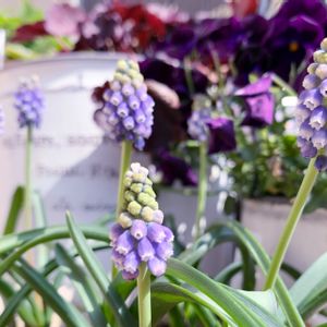 白い帽子をちょこんとかぶったムスカリ🪻 いつものお花屋さんで寄せ植えしたのをゲット🧺 いつもは自分で寄せるんだけど、たまにはいいんじゃない⁉️