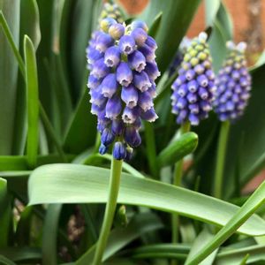 ムスカリ タッチオブスノー やっと花に会えた(⁎˃ᴗ˂⁎) ♬*゜ 昨秋植えてすぐに顔を出した葉はもうのびのびで😅 なんだかお店で見るムスカリとは違うかんじだけどうれしい💕 そして、後ろに控えてるチューリップ🌷 2種類×3球植えたのですが、片方が全く芽が出ず、掘り返したら腐って小さな虫にまみれてました(😱ヒィ〜⚡️⚡️⚡️) なんとか除去したものの、空いたスペースどうするかなぁ土全部入れ替えるのやだなぁと、ダメもとでオルトラン撒いて別種のチューリップ球根(セールで半値✨)を10日ほど前に植えたら、すごい勢いで発芽しました(๑•̀ㅂ•́)و グッ! 間違ってるだろな〜と思っても、意外といける…時もあるガーデニング(* ˃ ᵕ ˂ )b