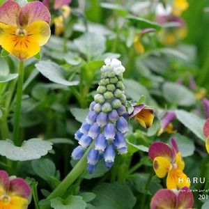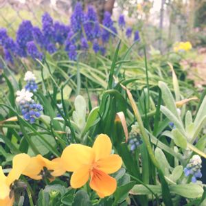 もらいもののオレンジのビオラ、紫と合う。白とブルーのグラデーションムスカリ、植えっぱなしで名前を忘れてしまった(>_<)