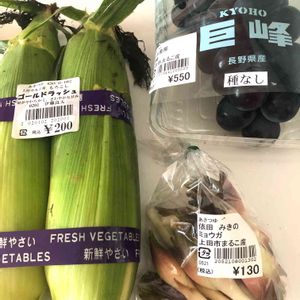 新鮮な果物食べたくて 徒歩五分の野菜直売所へ🚶♀️ 種無し巨峰が安かった🍇 🍑は横に居た婆ちゃんに奪われました‼️ 観光客目当ての小さな直売所で 品数少ないけど新鮮な野菜や果物が 格安です😊 開店数分前だと、荷物下ろし切れてなくて お客さんも荷下ろし手伝っちゃう🤣 田舎ならでわの店です✌️