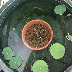 蓮の葉が広がってきました。 本当は睡蓮鉢に直接土を入れて植えた方が 良いそうです。 来年、植え替えの時にそうします。 今年は葉っぱを楽しみます。 さて何年で花が咲くのかなぁ〜❣️