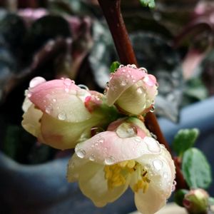 こんにちは😊 ボケ(ゆめ) オカメザクラ ガーデニングシクラメン ビオラ シルバーリーフ 🏷️水滴の水曜日 ①ベランダで咲き始めたボケ(ゆめ)ですが溶けた雪の水滴が…❄️🫧 ②こちらも咲いたばかりの花壇のオカメザクラ🫧 ③④⑤ベランダのお花さん達の上に昨夜は雪が薄っすら積もっていました❄️🫧 ビオラさん水滴で頭が重い…😂😂
