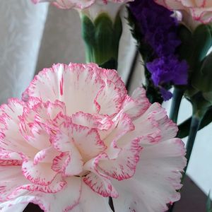 こんにちは😊 ①カーネーション ②ビオラ ①ピンクの縁取りが優しい印象のカーネーションです🤍🩷 ②こちらも黄色に薄紫の縁取りがモダンなビオラさん😍😍 縁取りのあるお花に何故か惹かれます🤭