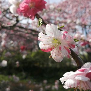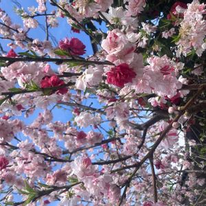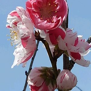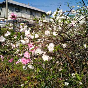 同じ枝先に桃色の花弁と絞りの花びらが付いていました。樹高4m程の幹から拡がった枝々に桃色、白、絞りの花々が咲き競っています。オイレ