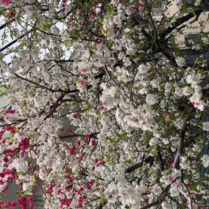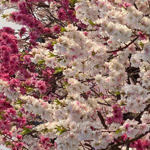 公園で見つけた 一本の桜の木‼️ こんな桜(多分この時期だから桜だと…)初めて見ました‼️ こんなに色鮮やかでゴージャスな‼️ 一本の木で こんなに三色も色が別れてるなんて‼️不思議 八重桜だと思うのですが…