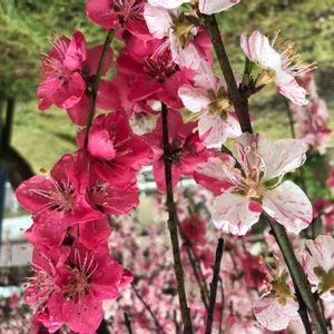 4月10日 鳥取県倉吉市 桜でしょうか、梅でしょうか? 葉は芽吹き始めです。 1本の木に紅色、桃色、白色の花が咲いています。 接ぎ木したのでしょうか? フシギ、キレイです。