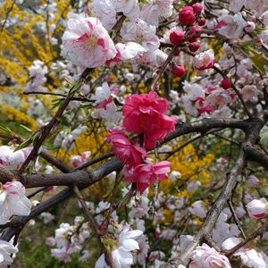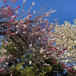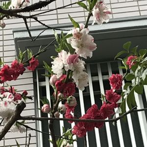 今日、京都の山奥で綺麗に咲いてました 雨蛙さんにベンケイハナモモだと教えていただきました ありがとうございます 赤やピンクや白の花が1本の木に色とりどり咲いてとても綺麗でした