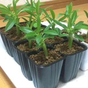 5月に種まきしてまだ2ヶ月経過していませんが、プレステラ90 に10本はかなりキツキツだったので植え替えてあげました。 様子を見ながら日当たりのいい場所に移動していきたいと思います。
