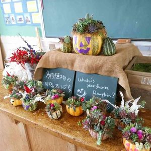 今日は息子の通っている中学校で 職業体験の講師として、寄せ植えを 教えに行ってきました。 ハロウィン仕様で生のカボチャを 使っての多肉の寄せ植えです✨ とても楽しかったです😄