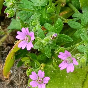 ヤワゲフウロ(柔毛風露) フウロソウ科フウロソウ属 別名 ゲラニウム・モレ ヨーロッパ地中海沿岸原産 世界的に広まり、日本では、1976年に、室蘭市で初めて野生化状態のものが確認され、その後、各地で帰化状態にあるそうです。 道端のコンクリートの隙間に、 他の草に混じって2株、少し距離を置いて生えていました。 よく見かけるアメリカフウロと比べて、花の色が濃く、 直径1㎝くらいの小さな花ですが、 目にとまりました。 10弁花のように見えますが、 花弁の先が2つに裂けているので、 5弁花です。 葉は、根生葉と茎につく葉は、 形や大きさが違っていました。 わたしは、初めて、目にしましたが、 野生化して、あちこちで、見かけるようになるのかな~🤔