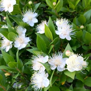 ギンバイカ(銀梅花)は英名でマートルと呼ばれる 香りのいいハーブです。 長い雄蕊を放射状に伸ばした純白の花は 清楚でとっても綺麗です。 新緑の葉っぱや まん丸の蕾とのコラボも素敵です。🤗✨ ヨーロッパ地中海沿岸原産。 フトモモ科ギンバイカ属の常緑低木。