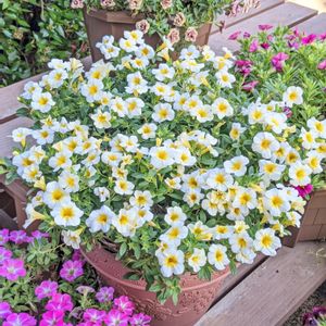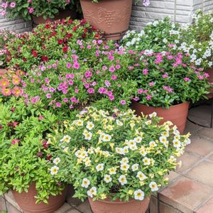 ミリオンベルのホワイト 涼しくなって花付き良くなりました😊 日本の夏は暑すぎなんですね🔥 来年は配置場所を変更しようと思います 今年ミリオンベルは… レッド、ホワイト、チェリーピンク、バターポップコーン 2年目は… チェリーピンク、イエロー 育てました どれも綺麗でした👏 冬越しさせて来年大きく育てたいです