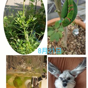 キアゲハ🦋の幼虫(左上)がまた育ってきてます😆小さい子も何匹か居ます🎵パセリが無くなるぅ〰️😆 (右上)この子は、誰🦋の子⁉️🤔🤔 (左下)マイブーム✨デトックスウォーター✨4L用です🎶 オレンジは、日本産じゃないので💦皮を剥くから沈んでしまう😓 ※オレンジ ※デラウェア ※レモンバーム