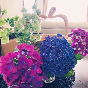 庭の紫陽花をリビングでも楽しみたいと飾りました(✻´ν`✻) オレガノケントビユーティも一緒に🌿🌿