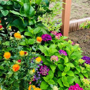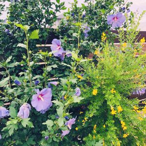 ムクゲ💜 黄色の花と一緒に(´∀`)人(´∀`)