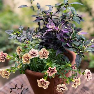こんにちは✿ᵕ̈* ちょっと大人な雰囲気の寄せ植え𖥧𖤣 ミリオンベルプチホイップ ラムレーズン❁⃘*.゚ 最初の切り戻しから、なかなか咲かなくて やっとここまできましたf^^*) 鑑賞用トウガラシパープルフラッシュ❁⃘*.゚ ヘリクリサムライムミニ❁⃘*.゚ 見えないけど、入ってます( ̄▽ ̄;)