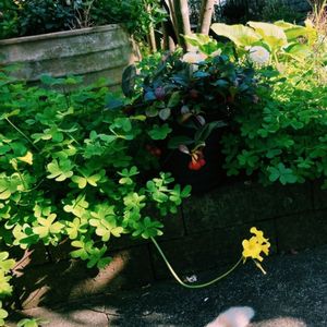 地植えにしておいた イエローオキザリスが 木陰で咲いてました💛 桃の輝きもまだまだ葉っぱが 小さいのに一輪咲きそうです💗