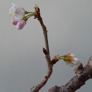 サクラの仲間の実生です.候補は,サクランボ・アメリカンチェリー・モモ・サクラのどれかです.前の3種は,種を食べ播きした記憶があります.サクラの種はどこかから拾ってきたかもです.ずいぶん長く鉢植えになっていて,初めて花が咲きます. 撮影 Mar. 3, 2021 花びらの先端が切れ込んでいること,3月に咲いていること,萼筒が壺形であること,などから,カラミザクラとしました.カラミザクラは唐実桜の意味で,園芸店では暖地サクランボという名で売っているようです. 随分前に購入したものが枯れてしまったのですが,それの子供らしいです. Mar. 8, 2021