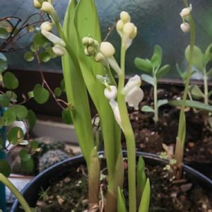 早朝のスズラン💚 だいぶ大きくなり花も咲き始めました。 4/16から部屋に入れたままだったので花芽が徒長気味(笑)普通葉にくるまって花咲くのにね🌞💦