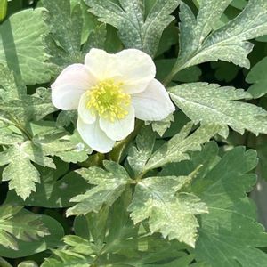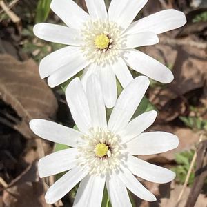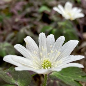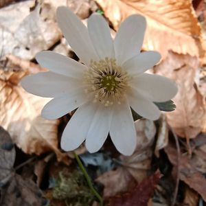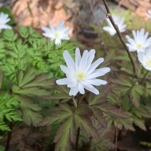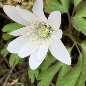 アズマイチゲ(東一華) *キンポウゲ科イチリンソウ属 花期は3〜5月 北海道〜九州の落葉樹林内や林縁、草地に生える多年草! 高さ15〜20cmほど! 花は上向きに開き、白い花弁のように見える長楕円形の萼片を多数付けます! 雄蕊.雌蕊は多数あり葯も白! 茎葉は3輪生、3出複葉し垂れ下がるのが特徴的! 似たキクザキイチゲのように、葉が深く切れ込む事はありません! 花糸付近が紫色なっているのもポイント! 木々の葉が広がる頃には、地上部がは枯れてなくなり翌春まで地下で過ごす スプリングエフェメラルの1つ❣️ 4月5日撮影