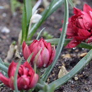 チューリップが次々と開花して嬉しい毎日 ライラックワンダーとほぼ同時だったけど 次に咲いたのは初めての八重のチューリップ🌷 原種チューリップのテタテ 小さな球根だったから可愛らしい小さめのお花なのかと思ったけど なんだかとってもゴージャス✨ これも房咲きというのか...下にはまだ蕾がいくつもあって、3つか4つずつ咲いてくれそうです♡ このシックな赤がとってもイイ色❤️ 原種の特徴なのかな?花弁に縦にスッと入る筋も見えてそれもまたチャームポイント♪