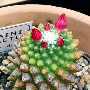 daiso産の マミラリア・トルカさんのお花さんが咲いてました😻💚🤍💗 前回は蕾ちゃんを確認してたのに 開花を魅逃してしまい…😹💧 今回は蕾ちゃんを魅逃しました…😹💧💧 後ろは エケベリア・プロリフィカさんの友情出演です😸💞